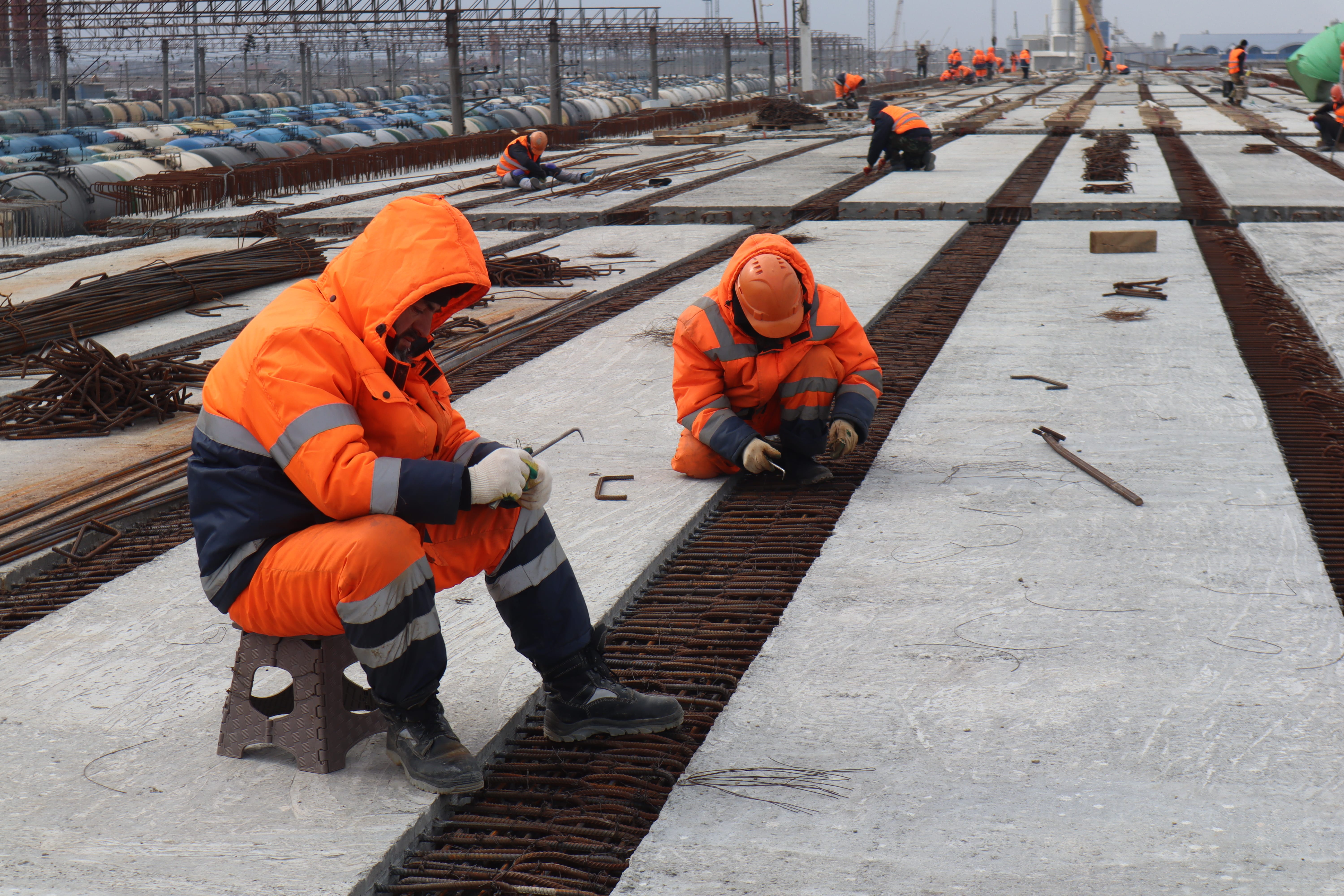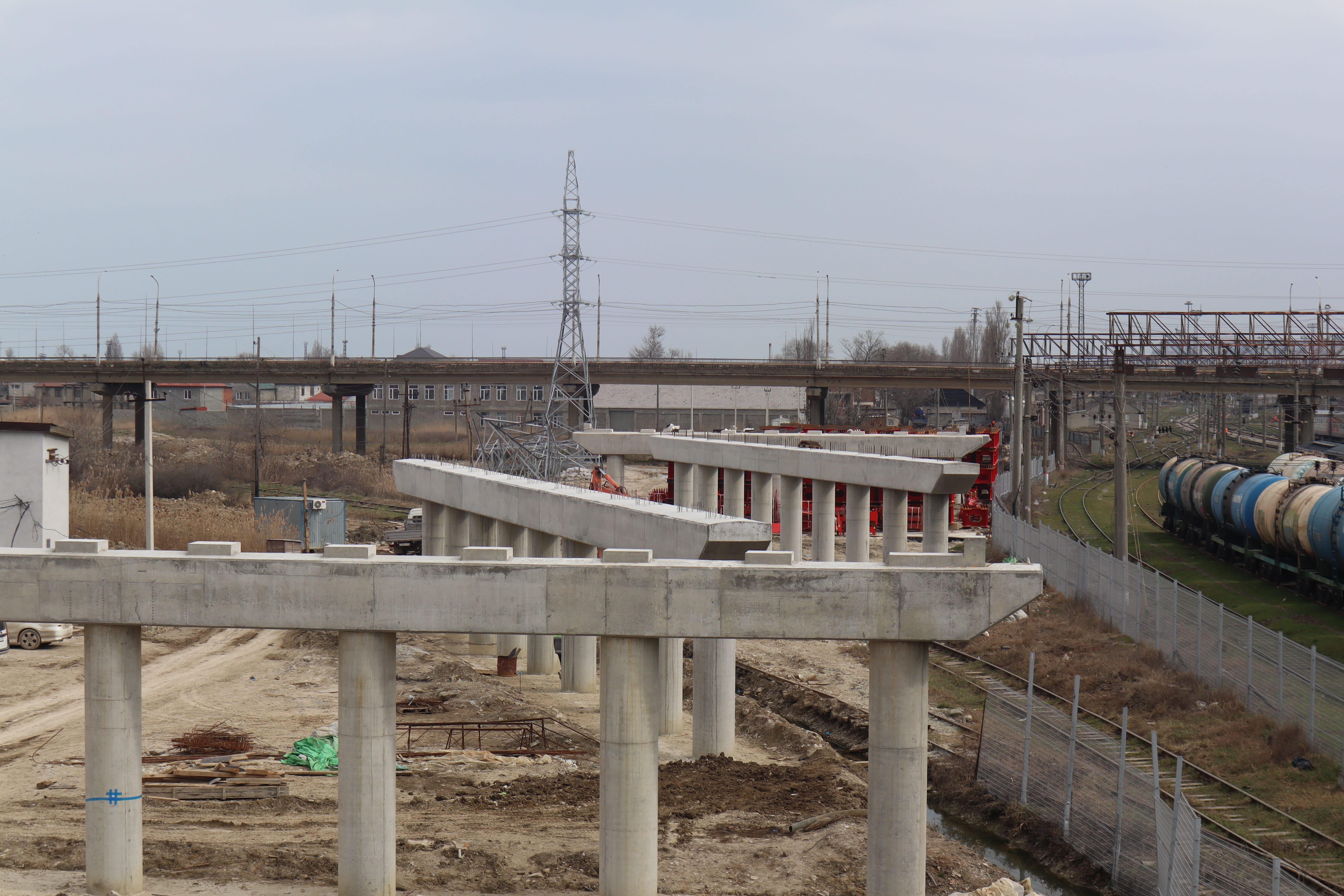 Параллельно ведутся работы по устройству подпорных стен, прокладке водоотводных систем, переустройству линий электропередачи и газопровода. Также продолжается устройство опор надземного пешеходного перехода.